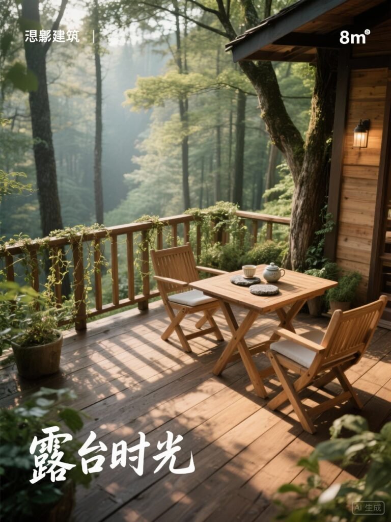 观景露台:8㎡防腐木地板(芬兰进口赤松,经过高温碳化处理),1.2m高木质栏杆(间距≤10cm,符合安全标准)