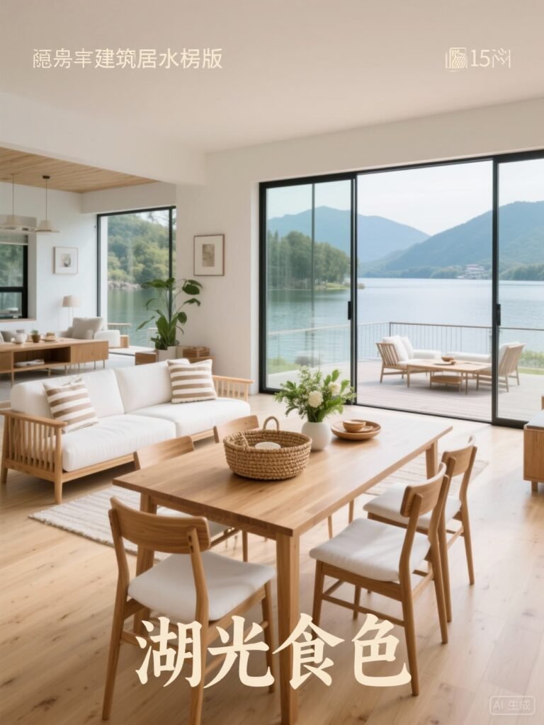 • 无界视野设计:临湖面采用12mm厚超白玻璃(透光率91.5%),2.8m×4.5m电动滑移门(开启宽度70%,静音≤55dB) • 气候适应性布局:客餐厅地面采用辐射供暖系统(水温32℃),天花板嵌入式冷风幕(出风温度18℃,风速0.8m/s) • 自然材质美学:餐桌采用整块胡桃木(厚度5cm,经过碳化处理防开裂),沙发坐垫为亚麻与有机棉混纺(比例7:3)